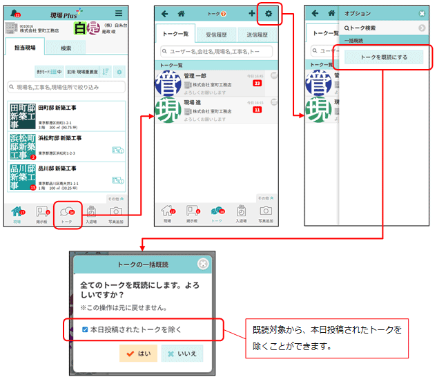 * 各現場のトーク一覧でも同様に一括既読できます。