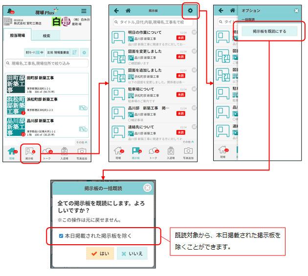 * 各現場の掲示板一覧・設計変更掲示板一覧でも同様に一括既読できます。