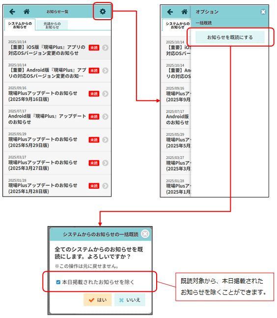 > 本日を除く:本日掲載されたお知らせを除いて既読にします。