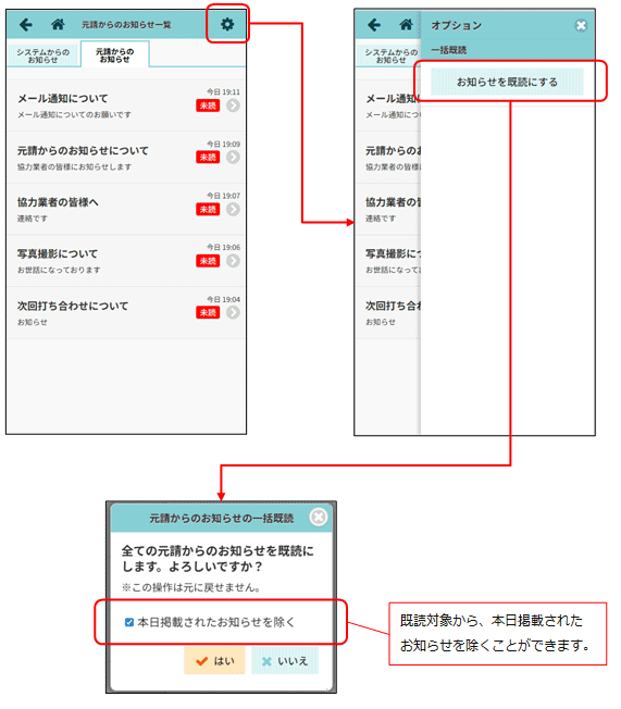 * 未読の「システムからのお知らせ」「元請からのお知らせ」を一括で既読にできるようになりました。