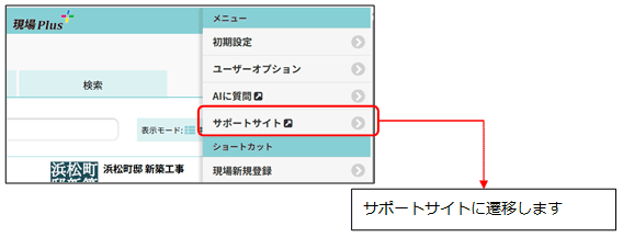 * メニューにサポートサイトへのリンクを用意しました。操作マニュアルなど、現場Plusに関する情報をサポートサイトで確認できます。